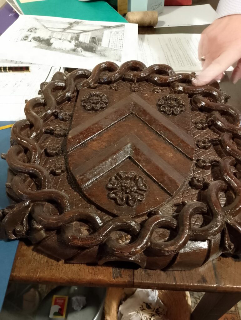 The principal floor had been occupied as the king’s dining room, the northern end cut off by a screen, the walls panelled and the ceiling supported upon heavy moulded beams with large carved bosses at the intersectionsโone of which had Bishop Russell’s rebus, a thrush or throstle with the motto ‘Verus celluy je sui,’ the other had the bishop’s arms. The upper stories were divided into several rooms (of which there were ten in total).