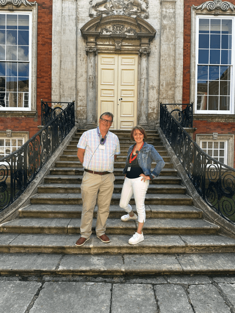 (Left) Sarah and Andrew outside the entrance to what would have been the castle’s great hall, and (right), outside the south wing, the side of the castle containing Katherine’s original apartments.