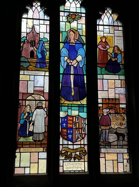 Although almost all the Tudor interiors have disappeared, the extant sixteenth-century buildings have been secured for the foreseeable future. Today, the principal features of interest to the Tudor time traveller are the outer and inner gatehouse, the range of buildings to the right of the inner gatehouse (as approached across the now in-filled moat), and The Great Tower. This latter building once contained Katherine’s privy apartments. The great hall, chapel and Great Chamber are lost. However, as you tour the grounds, you will see their imprint outlined in the grass. The small stone-built chapel appended to the rear of the modern church was reconstructed to mark the site of the original chapel.