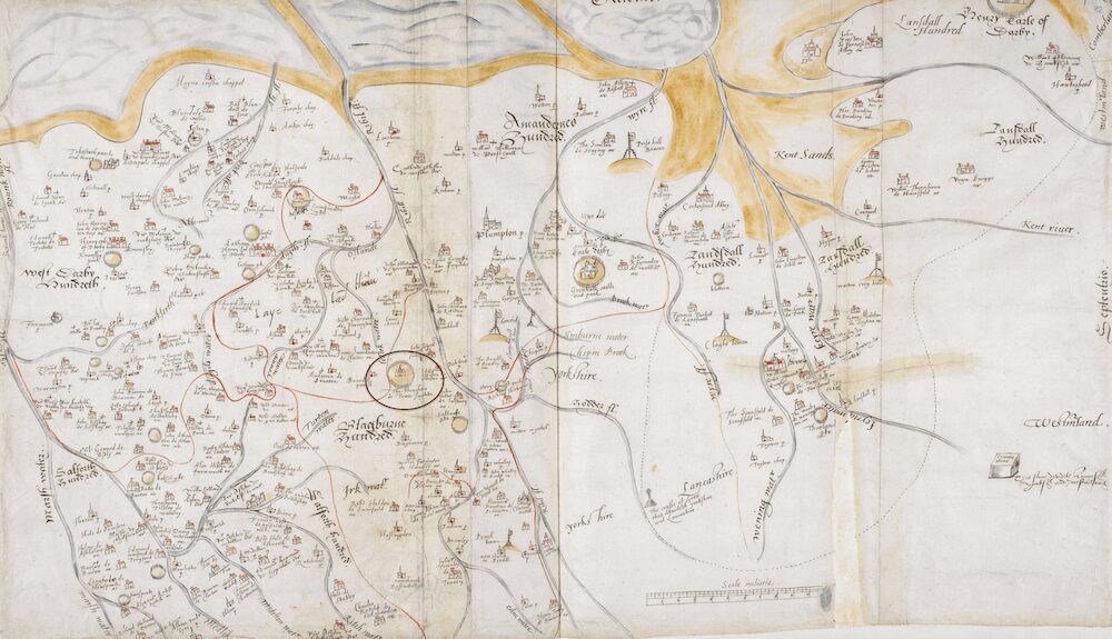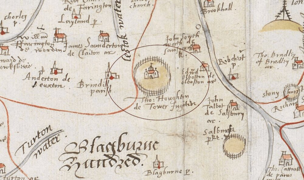 Lord Burghley’s Map of Lancashire. Note Thomas Hoghton and Houghton Tower is annotated ‘Fugitive’.